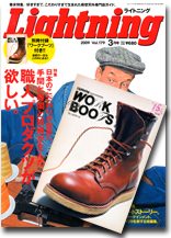 《Lightning 2009/3月号 Vol.179》別冊付録「ワークブーツ」のP.91にスチロコの【ホースハイド・エンジニアブーツ】が紹介されました。是非、ご購読ください。 |