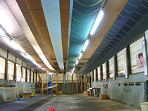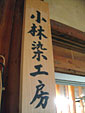 奥に見える柱は、北山杉。無節の丸杉で湿気を微妙に感じ取ると言う。湿気があるときは、縄はしっかりと結ばれ、ないときは縄が上下しやすくなると言う。これにより染料の乗りや染具合を調整する参考になると言う。写真は、小林氏による染風景である。上に吊るされた反物は、染められ乾燥されているちりめんの数々。