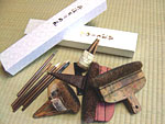染色前にちりめんに打ち込まれる道具。一反(約25m)のちりめんに均一に張りを保つ為に、小林氏の手作業で50〜60本打ち込まれます。