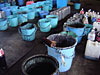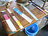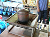 粉の染料を湯で溶かし原色を作り、出来た原色を調合し白地のちりめんに色を乗せ、簡易蒸し器で蒸しを行い色を見る。長年培った経験と小林氏の感覚だけで色を出す職人技を実感できます。