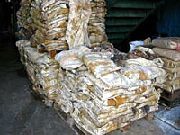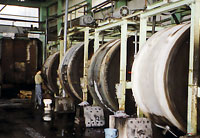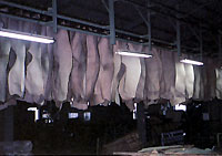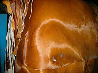 コードバンを原皮から製品革に仕上げるタンナー(皮革製造業)は、日本の(有)新喜皮革とアメリカのホーウィン社で、世界でも二社しかないそうです。 原皮は毛が付いたまま腐敗防止のため塩漬けにされた状態で神戸港に入港します。